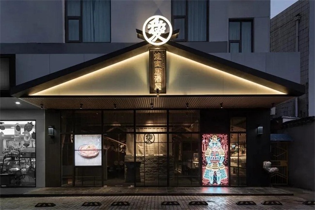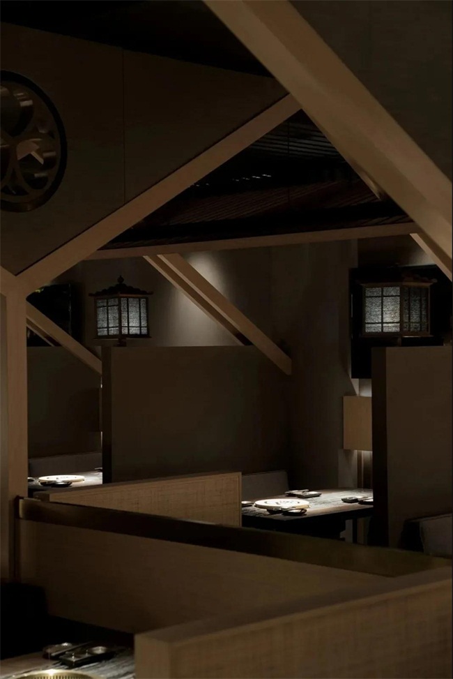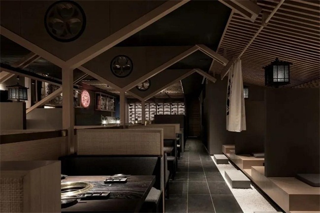 愛燒肉居酒屋設計理(lǐ)念還(hái)原了日(rì)本狹窄擁擠的街道形象,餐廳的入口設計為三角形的坡屋頂,意圖用強烈的三角形房頂來表達日式建築 。