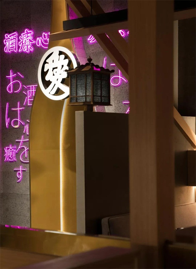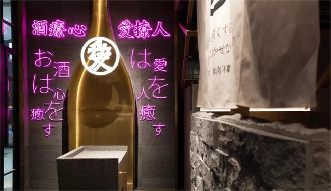 店門口的霓虹燈武士像和牆上掛著的“愛”字標識都突顯日本武士道精神。