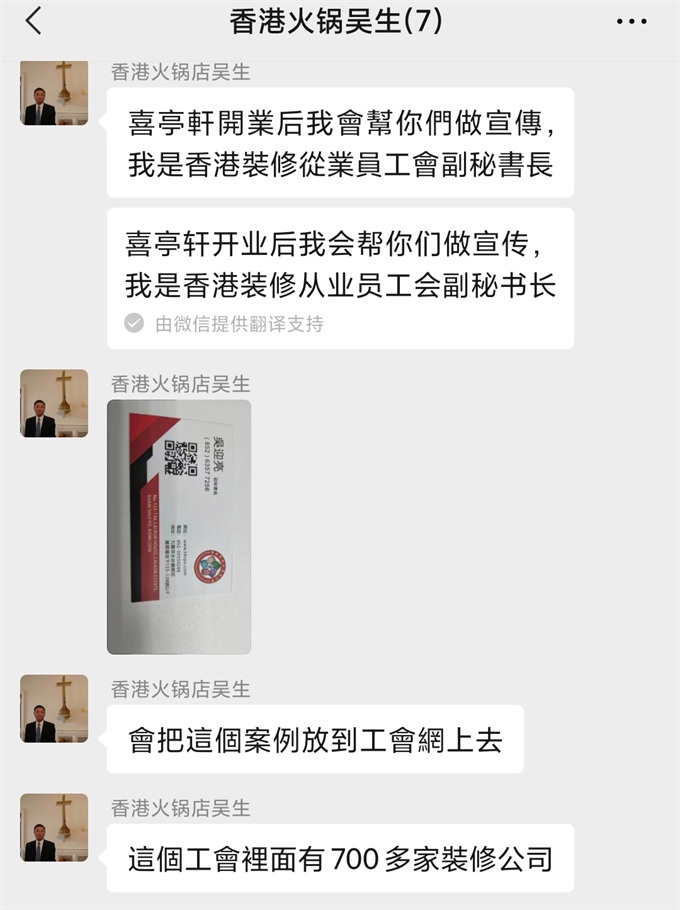 在和喜(xǐ)亭軒火鍋項目負責吳先生合(hé)作的(de)過程,公司和吳先生(shēng)都會站在對方的立場上做事情,雙方都很配合。這個訂單生產的很順(shùn)利。我們(men)的產品到達(dá)客戶餐廳後得到客戶的認可。在和(hé)吳先生的溝(gōu)通中得知他是香(xiāng)港裝修從業員工會副秘書長,會幫助我們宣傳產品。