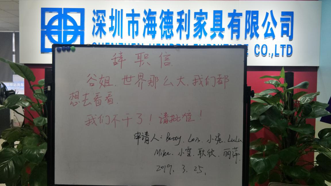 2019年3月(yuè)25 日(農曆2月19日)是(shì)公司外貿部老總穀姐的生日(rì),是一個充滿驚(jīng)喜(xǐ)的好日(rì)子。早上九(jiǔ)點鍾,穀先生便叫我(wǒ)帶(dài)上筆記(jì)本陪同穀姐一起出發外貿部,一到外貿部門口,看到門居然是鎖著的,隔著玻璃門往裏一瞧,天哪!怎麽職場裏是空蕩蕩的?今天是星期一,該(gāi)是上班的(de)時候了,小夥伴們都去哪(nǎ)兒了?再仔細一(yī)看,哎呀!門口還擺著一(yī)塊白板,上麵寫著(zhe)幾行字,竟然是一封集體辭職信,信是(shì)這樣寫的:“穀姐,世界那麽大,我們都想去看看,我們不幹了,請批準(zhǔn)!”。這怎麽可(kě)能呢?明知不可(kě)能,可心急的穀姐急於進去一探究竟,用(yòng)指紋(wén)鎖(suǒ)不停的按(àn)都開不了門,怎麽回事?天(tiān)天開鎖的指紋怎麽突然間不(bú)管用了(le)?我和穀先生也在一旁幹著急,穀姐還在不停的用指(zhǐ)紋開門,同時打電話想(xiǎng)問怎麽回事,可電話也沒有人接聽,怎麽辦?正在焦急萬分,不(bú)知所措時(shí),瞬間發現(xiàn)右側的走(zǒu)廊(láng)裏飛出了一道亮光,定(dìng)神(shén)一看,原來是生日蛋糕的燭光,隻見外貿部的小夥(huǒ)伴(bàn)們齊唱著生(shēng)日快樂歌,簇擁著生日蛋(dàn)糕緩緩的走過來,我們這(zhè)才回過神來,原來今天是穀姐的生日,連穀姐(jiě)也是如夢初醒被驚呆了!驚喜!真是大大的驚喜(xǐ)!