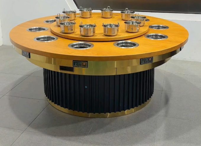 海(hǎi)德利火鍋家具為(wéi)您提(tí)供10人位一人一(yī)位無煙淨化小火鍋桌圖片展示價格說明定做(zuò)服務。10人位一(yī)人一鍋無煙淨(jìng)化小火鍋桌是(shì)一款為多人(rén)聚餐設計的創(chuàng)新餐桌,直徑2米,適合10人同時使用。每個座位都配有獨立(lì)的小火鍋,並內置(zhì)無煙淨化功能,有效消除油煙和異味,保(bǎo)持用餐環境(jìng)的清新,無需(xū)安裝排煙管道,使用方(fāng)便。 這款火鍋桌(zhuō)采用白蠟木材質,桌麵展現出自然的(de)木紋(wén)和(hé)溫潤的色調,既美觀又(yòu)實用。桌麵具備耐高溫、耐磨、耐刮等特點,經久耐用。每個座位配備了電磁爐或電陶爐,食客可以根據個人喜(xǐ)好(hǎo)調節火(huǒ)力,提供(gòng)個性化的用餐體驗。 無煙淨化小火鍋桌不僅(jǐn)適合家庭聚會,還非常適合餐廳、酒店等(děng)商業場所,既(jì)提升了(le)用餐體驗,又具備便利性和環保性。