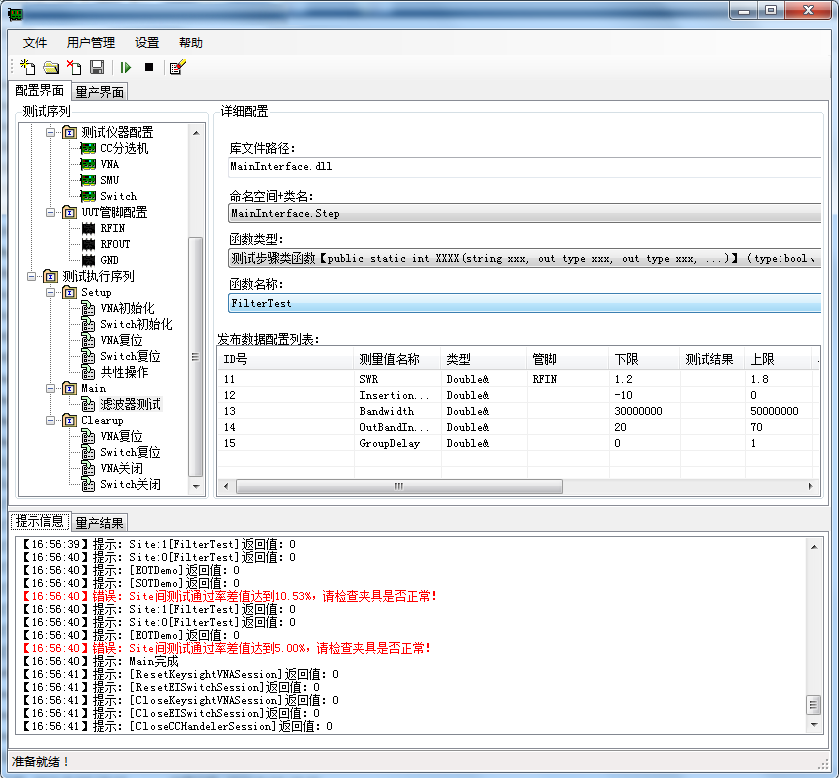 支持多(duō)線程(chéng)高(gāo)速並發測試。通過測試序列模板開(kāi)發包的(de)支持可快速完成多工(gōng)位並行測試(shì)序列編寫,期間所(suǒ)涉及的資(zī)源爭用、調度問(wèn)題均由軟件平台完成,開發簡潔,執行高(gāo)效,濾波器測試場景下測試速(sù)度可達到20000UPH。