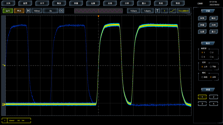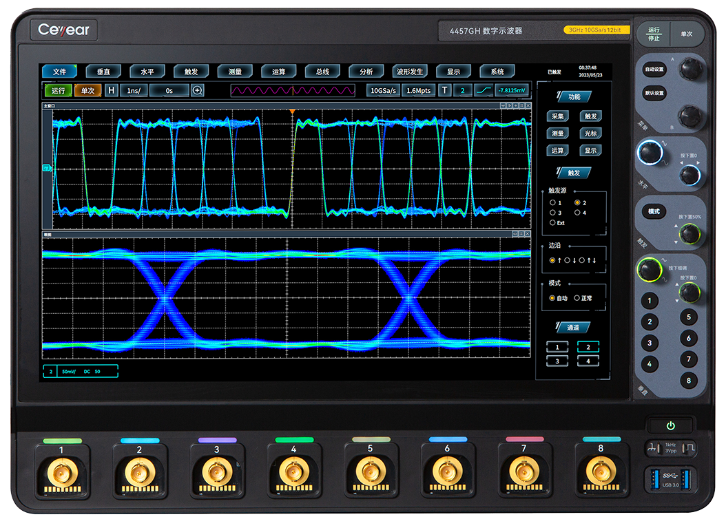 4457H係列示波器采用數字熒光三維顯示技術,通過顏色的亮暗或冷暖(nuǎn)來表示(shì)事件發生的概率,並提供正常、反相、色溫、光譜等4種波形色彩,增強了查看偶發(fā)事件的能(néng)力。