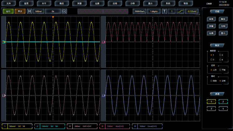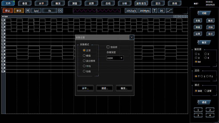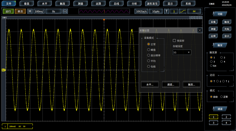 采用精確的數字觸發技術,直接對(duì)ADC采集樣(yàng)本進行觸發點測定,能抑製幹擾信(xìn)號影響,迅速鎖定觸發事件,為示波器準確的顯示和分析信號奠定基礎。數字觸(chù)發的觸發靈(líng)敏度最高0.1格。