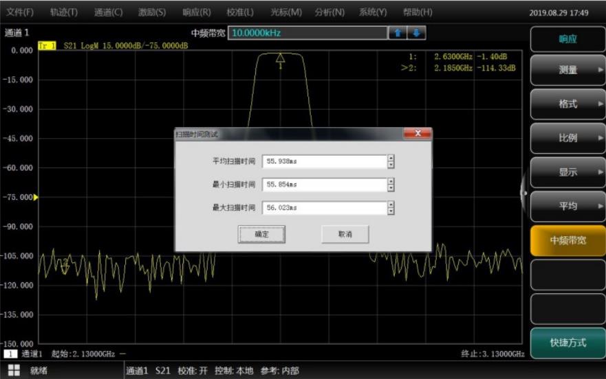 3671係(xì)列矢量網絡分析(xī)儀在全頻段201點掃描、600kHz中(zhōng)頻帶寬情(qíng)況下掃描速度可達43ms(典型值),並提供一鍵式掃描時間測試功能,方便評估。