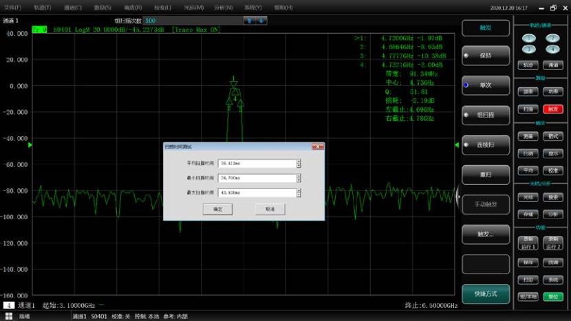 3650係(xì)列矢量網絡分析儀(yí)全頻段掃描,201點,600kHz中頻帶寬情況下掃描速度(dù)可達43ms,並提供一鍵式掃描(miáo)時間測試功能,方便(biàn)評估。