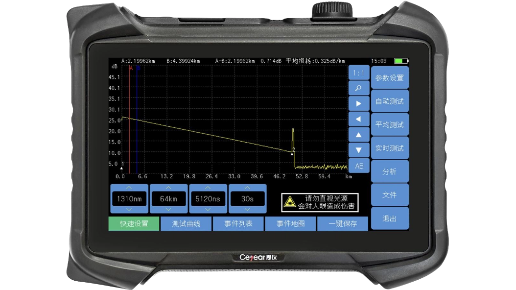 自動測試功能使得用戶無需了解更多的有關該(gāi)儀器操作的細節,測試步驟變得非常(cháng)簡單(dān),隻(zhī)需要進入自動測試(shì)模(mó)塊,將光纖接入產品對(duì)應 OTDR端口、點擊【測試】按鈕即可,儀器會自動設置相應的測試條件並最終給出測試結果,包括測試曲線和事件列表(biǎo)等。