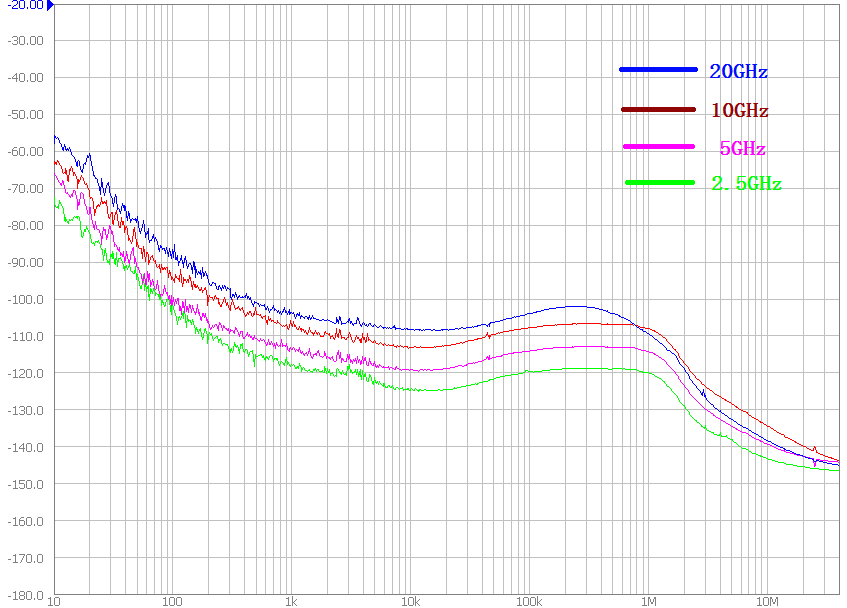 優異(yì)的相位噪聲指標:-110dBc/Hz@10kHz(10GHz載波,典型值1)