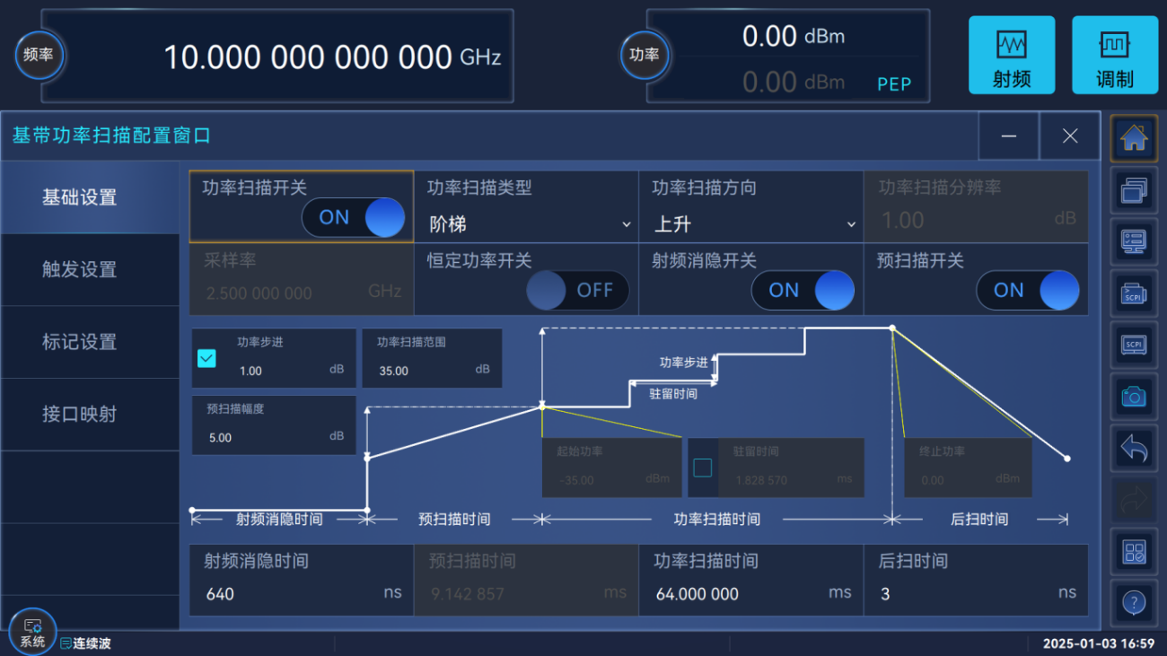 基於(yú)數字(zì)基帶(dài)的功率掃描信號與傳統功率(lǜ)掃描信號相比,具有幅度線性度高、掃描速度快(kuài)、精度高、射頻輸(shū)出(chū)功率(lǜ)40-50dB動態範圍,支(zhī)持射(shè)頻消(xiāo)隱、預掃描(miáo)、上升時間、下降時間靈(líng)活定製,支持掃描過程標記輸出等特點(diǎn),可支持百(bǎi)納秒級別的快速掃描。基帶功率掃描產生的信(xìn)號的主要應用(yòng)領(lǐng)域是放大器測試。