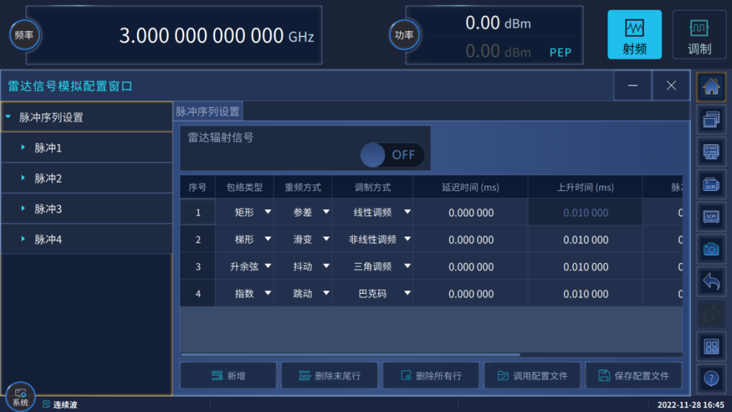 支持幅度調製、頻率調製、相(xiàng)位調製(zhì)及脈衝調製。具備雙脈衝、脈(mò)衝串、重(chóng)頻參差、重頻抖動、重頻(pín)滑變(biàn)等複雜脈衝調(diào)製(zhì)功能。