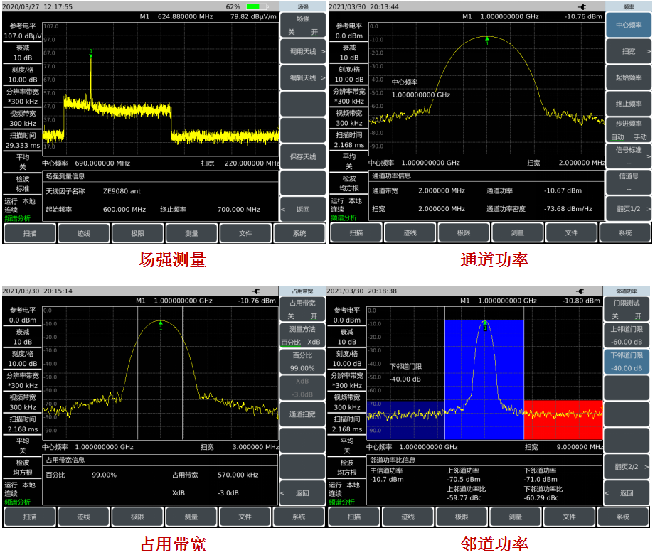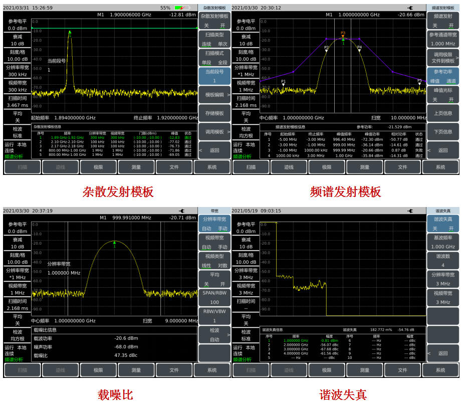 多種智能測量功能:場(chǎng)強測量、通道功率、占用(yòng)帶寬、鄰道(dào)功率、音(yīn)頻解調、諧波失真、頻譜發(fā)射模板/雜散發射(shè)模板、室內(nèi)/室外(wài)地圖測量等,支持GPS/北鬥(dòu)定位及對機內晶振的頻率馴服校準功能(néng)