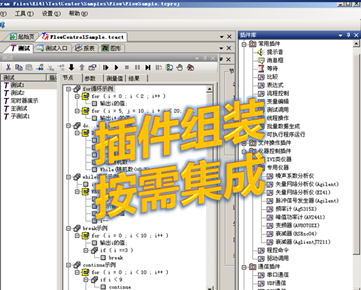 測試編(biān)輯(jí)器是TestCenter為用戶提供(gòng)的可視化、組裝(zhuāng)式、所見即所得的測試程序(xù)開發(fā)環境。TestCenter將測試程序的開發方(fāng)式由編碼(mǎ)型轉變為插件(jiàn)組裝(zhuāng)型,用戶隻需從插件庫中拖放所需的插件並組裝它們即可快速完成測試程序的開發。在測試編輯器中,用戶還可以方便地進行循環、跳轉、分支執行、條件執行及其它複雜流程設計。測試編輯器還提供斷點設置、單步運行等功能(néng),方便用戶進行測試程序調試。